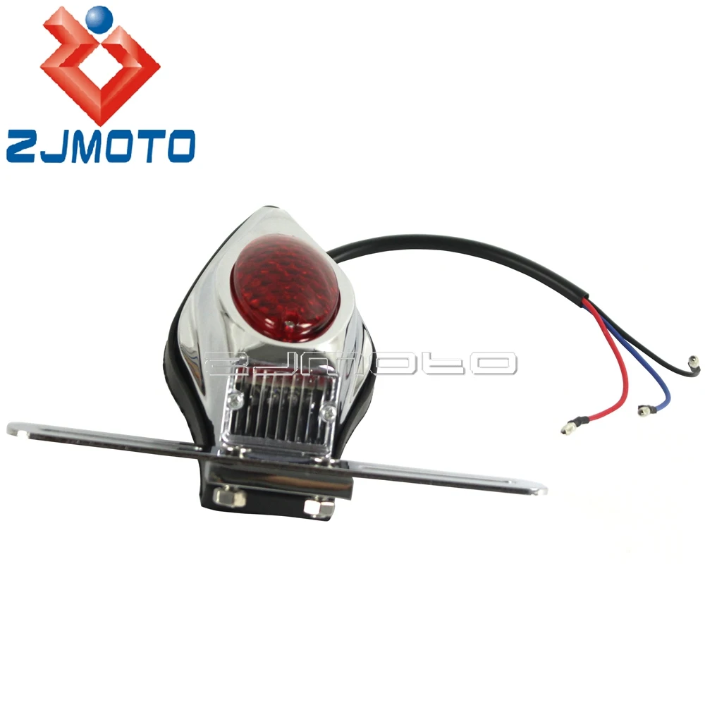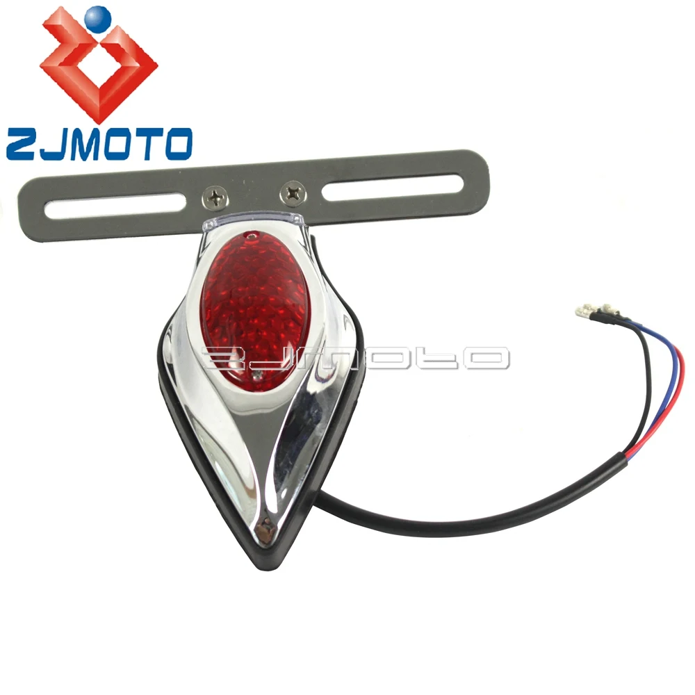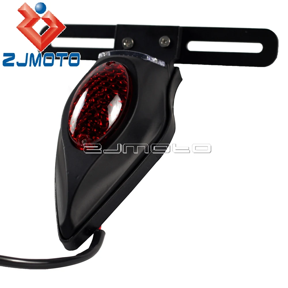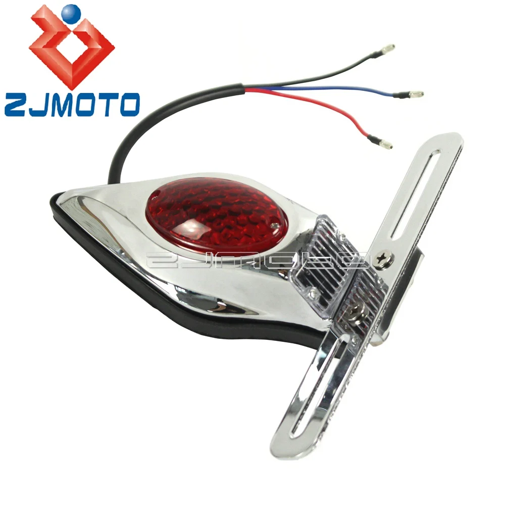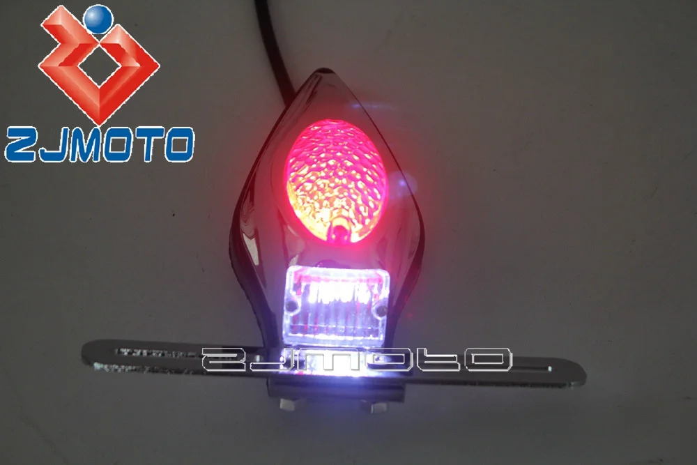 Brand New 12V Die-cast TearDrop Custom Fender Mount Tail/Brake light with illuminated license plate bracket. Red acrylic honeycomb pattern lens. Comes with a black rubber gasket, mounting hardware and 12V LED bulb. Slightly curved back to hug the fender. 3 wire lead 9" long with bullet connectors and black vinyl sheath. Give your bike a new Custom look!