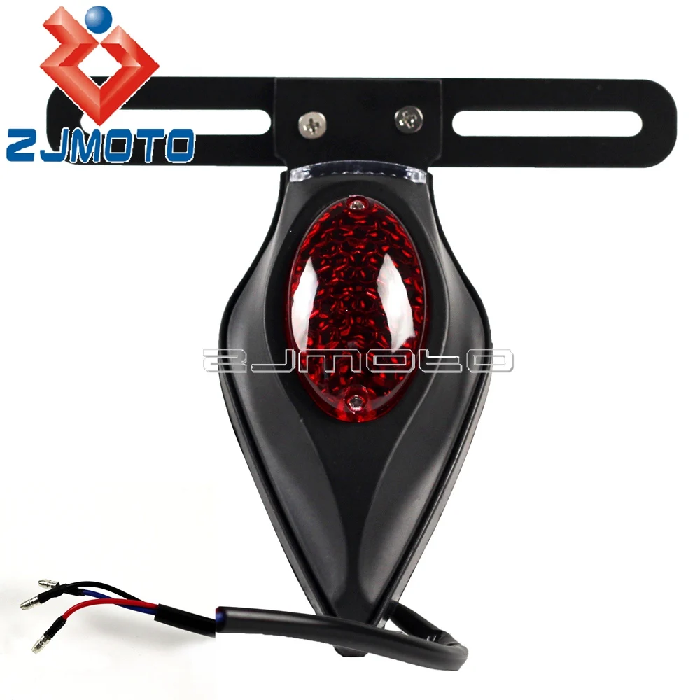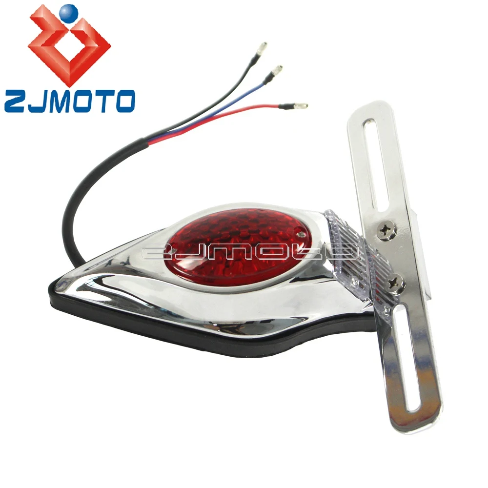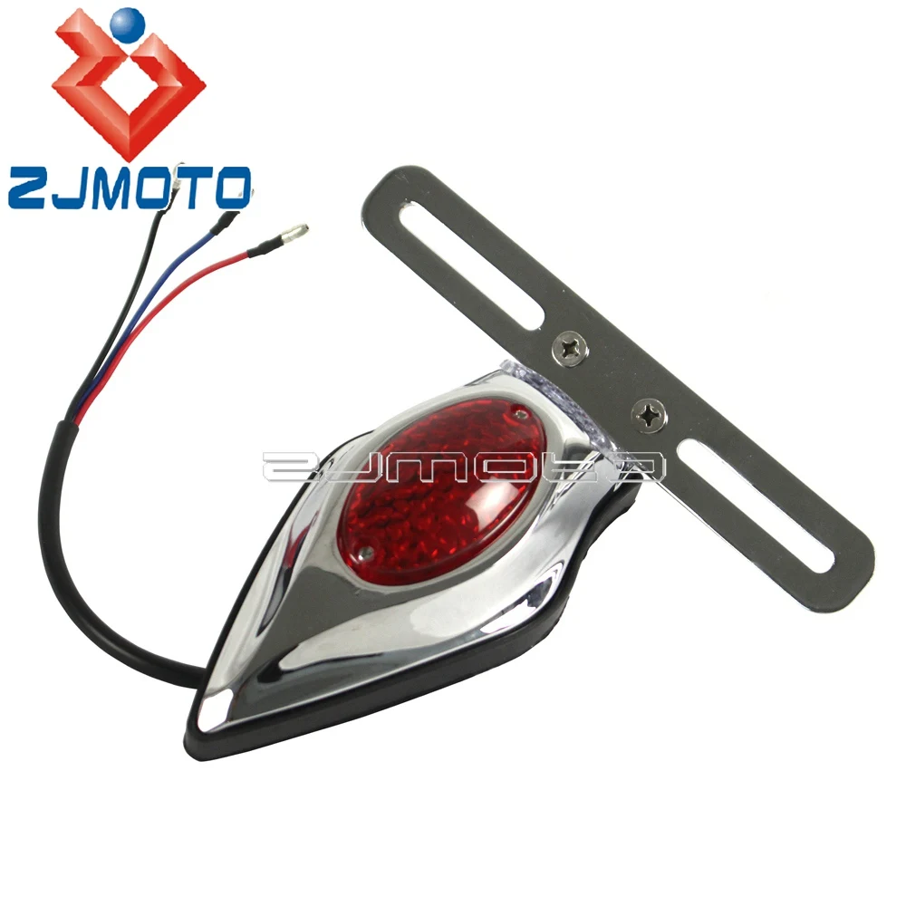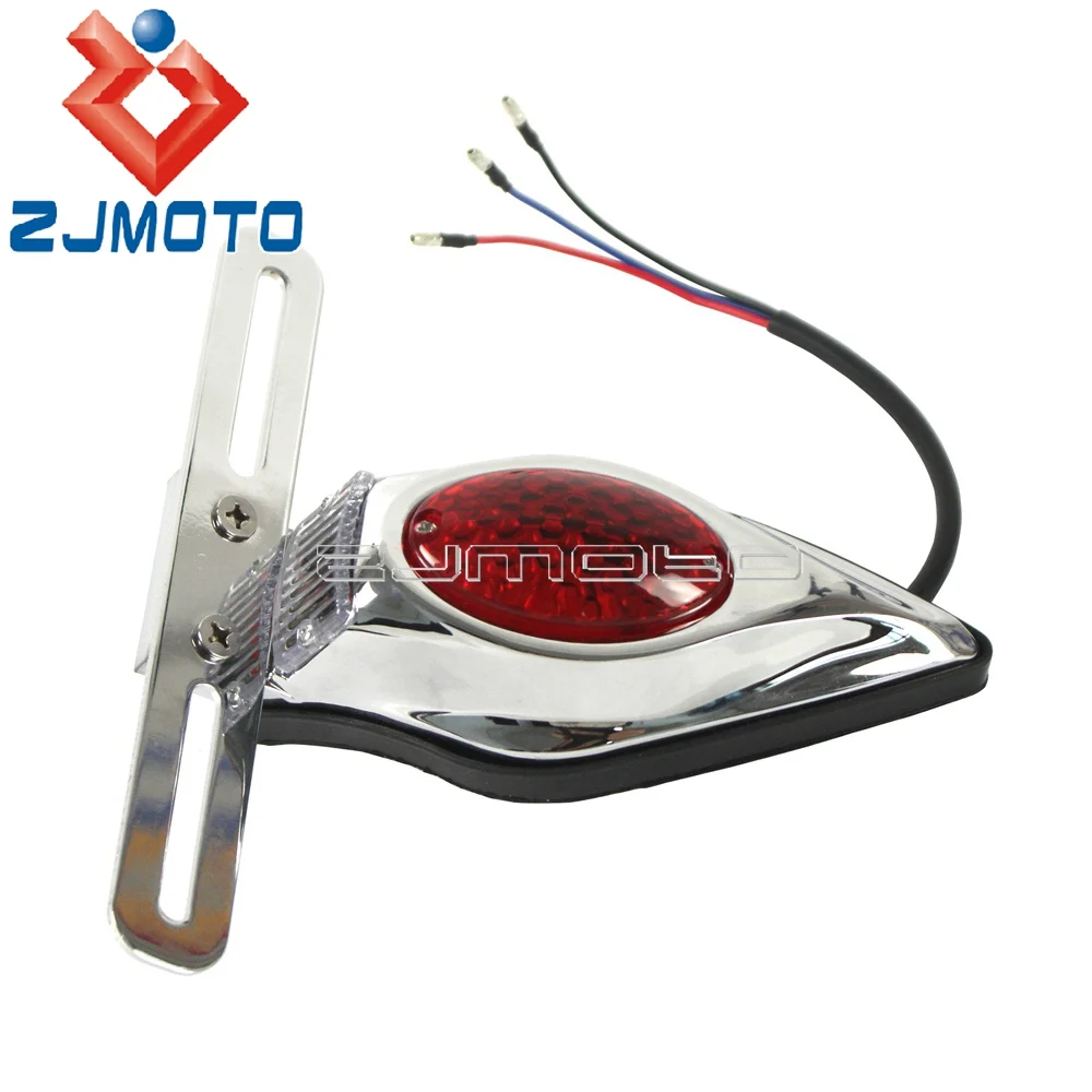 Brand New 12V Die-cast TearDrop Custom Fender Mount Tail/Brake light with illuminated license plate bracket. Red acrylic honeycomb pattern lens. Comes with a black rubber gasket, mounting hardware and 12V LED bulb. Slightly curved back to hug the fender. 3 wire lead 9" long with bullet connectors and black vinyl sheath. Give your bike a new Custom look!