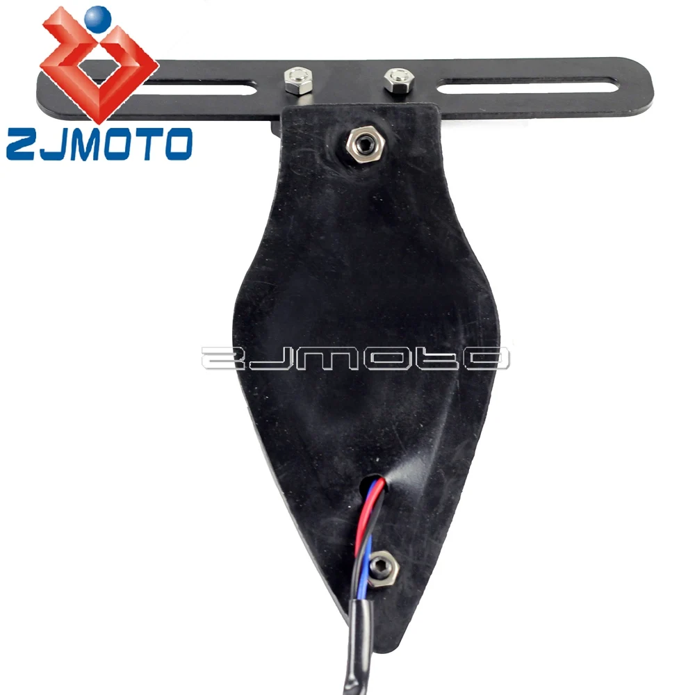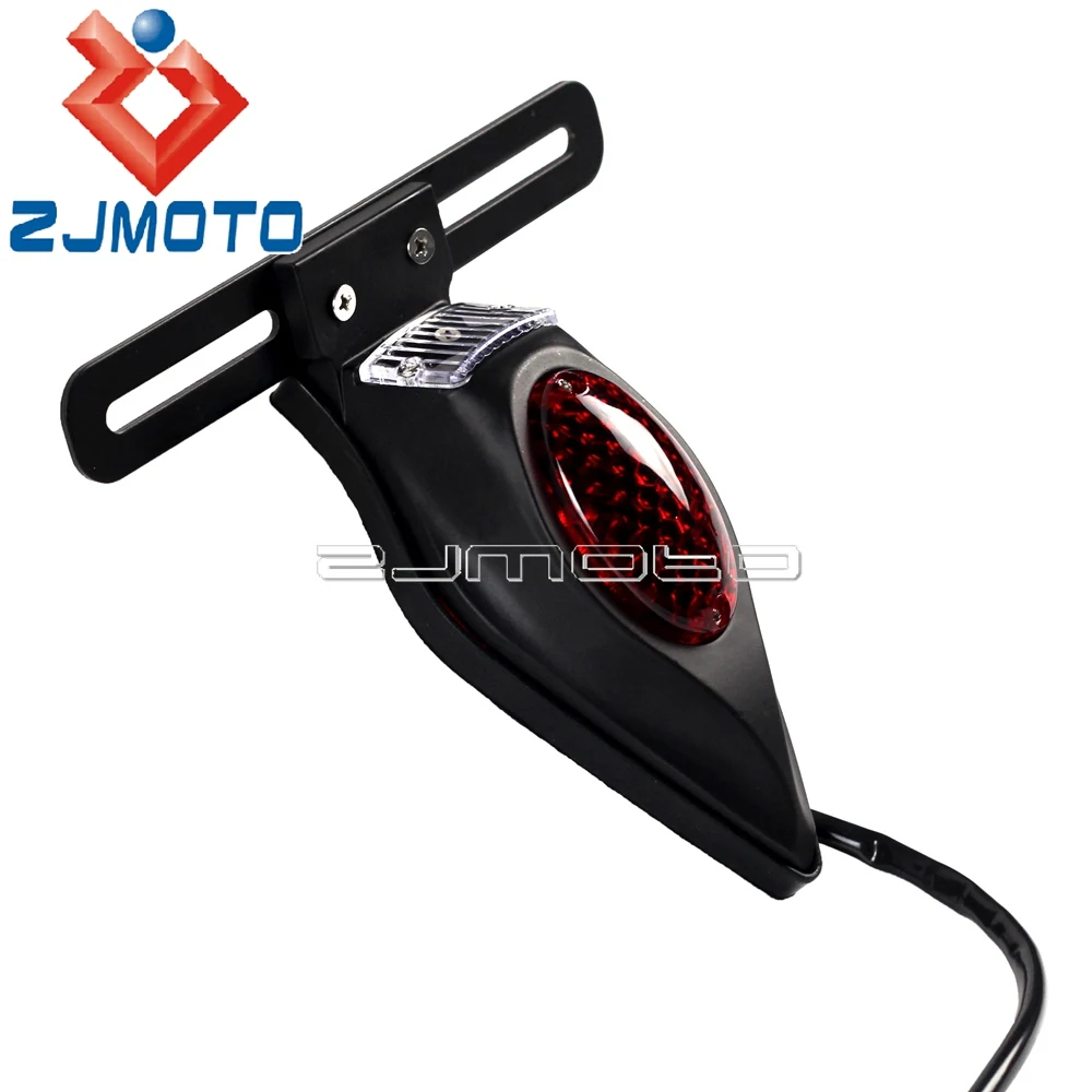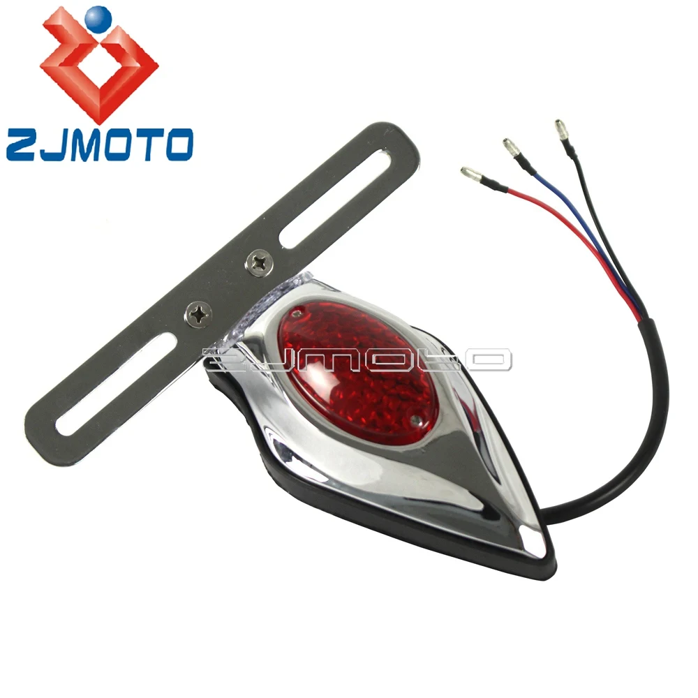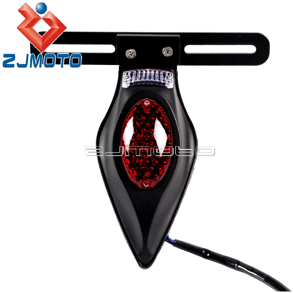 Brand New 12V Die-cast TearDrop Custom Fender Mount Tail/Brake light with illuminated license plate bracket. Red acrylic honeycomb pattern lens. Comes with a black rubber gasket, mounting hardware and 12V LED bulb. Slightly curved back to hug the fender. 3 wire lead 9" long with bullet connectors and black vinyl sheath. Give your bike a new Custom look!